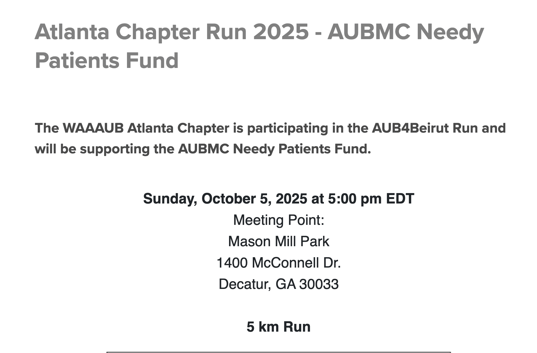 Join the WAAAUB Atlanta Chapter at Mason Mill Park in Decatur for this global run supporting the AUBMC Needy Patients Fund, which helps provide critical medical care for those in need.