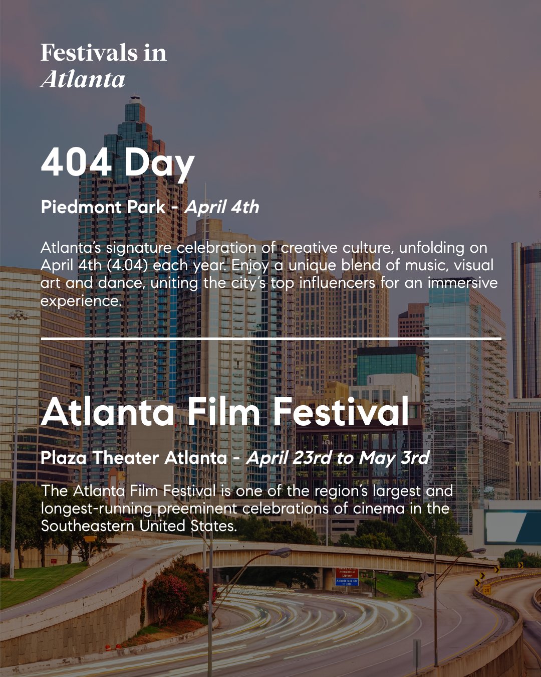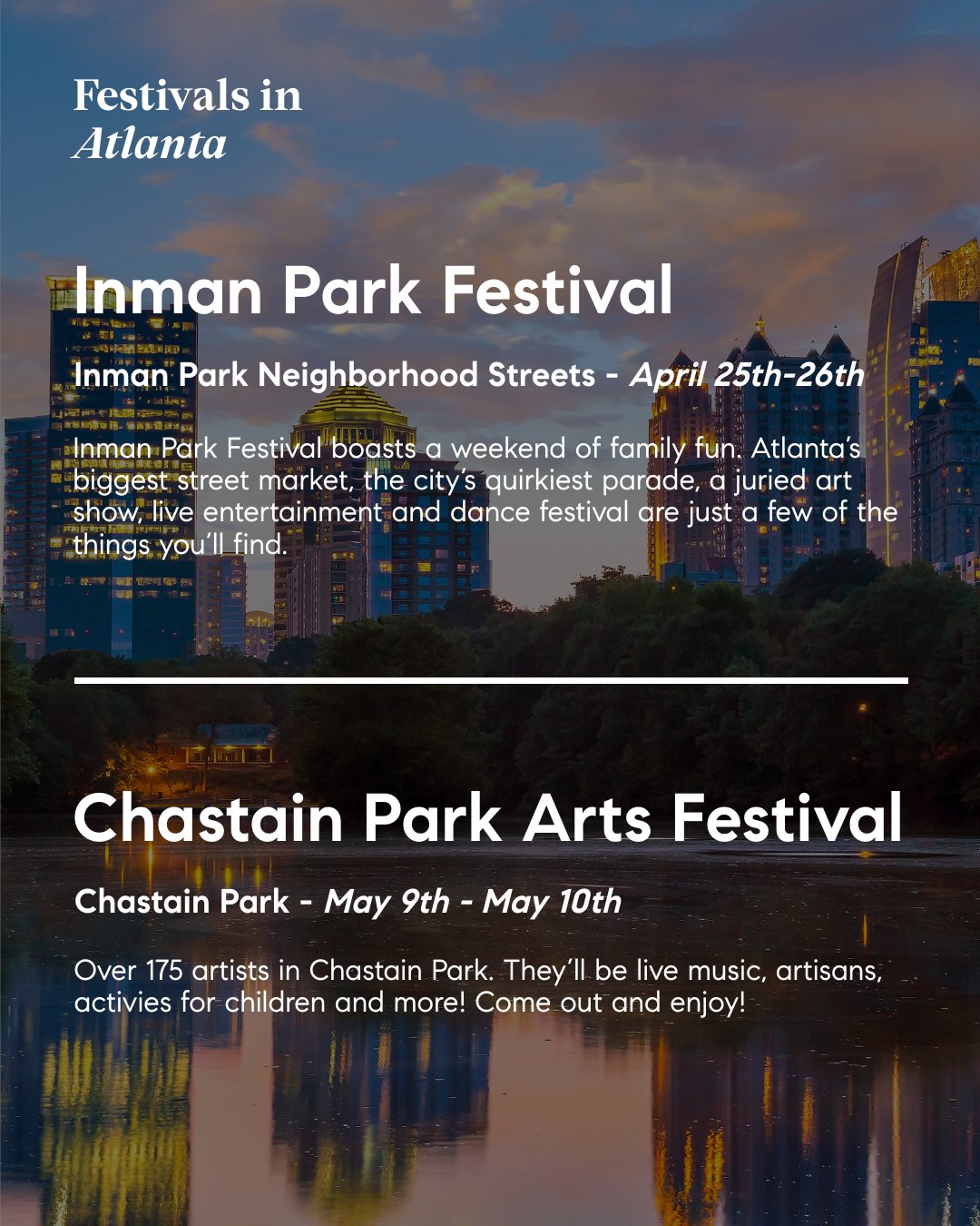 In Spring 2026, several major festivals will take place across the city, drawing locals and visitors alike. Whether you're strolling through art booths in Piedmont Park, watching independent films at the Atlanta Film Festival, or enjoying a historic neighborhood celebration in Inman Park, these events showcase the energy and creativity that make Atlanta unique.